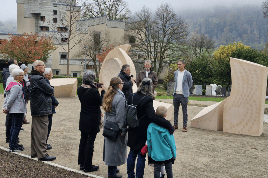 Stephan Fässler und der Neckertaler Künstler Det Blumberg Einblicke in die Planungs- und Umsetzungsphase des Gemeinschaftsgrabes. Sie erläuterten die Gedanken hinter dem Konzept und die Bedeutung der gestalterischen Elemente. Musikalische Beiträge der Musikgesellschaft